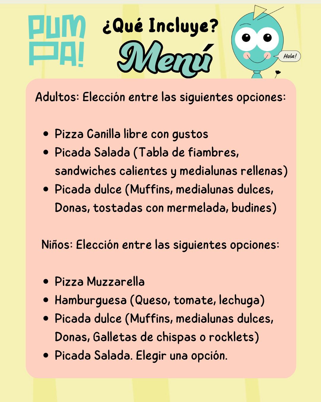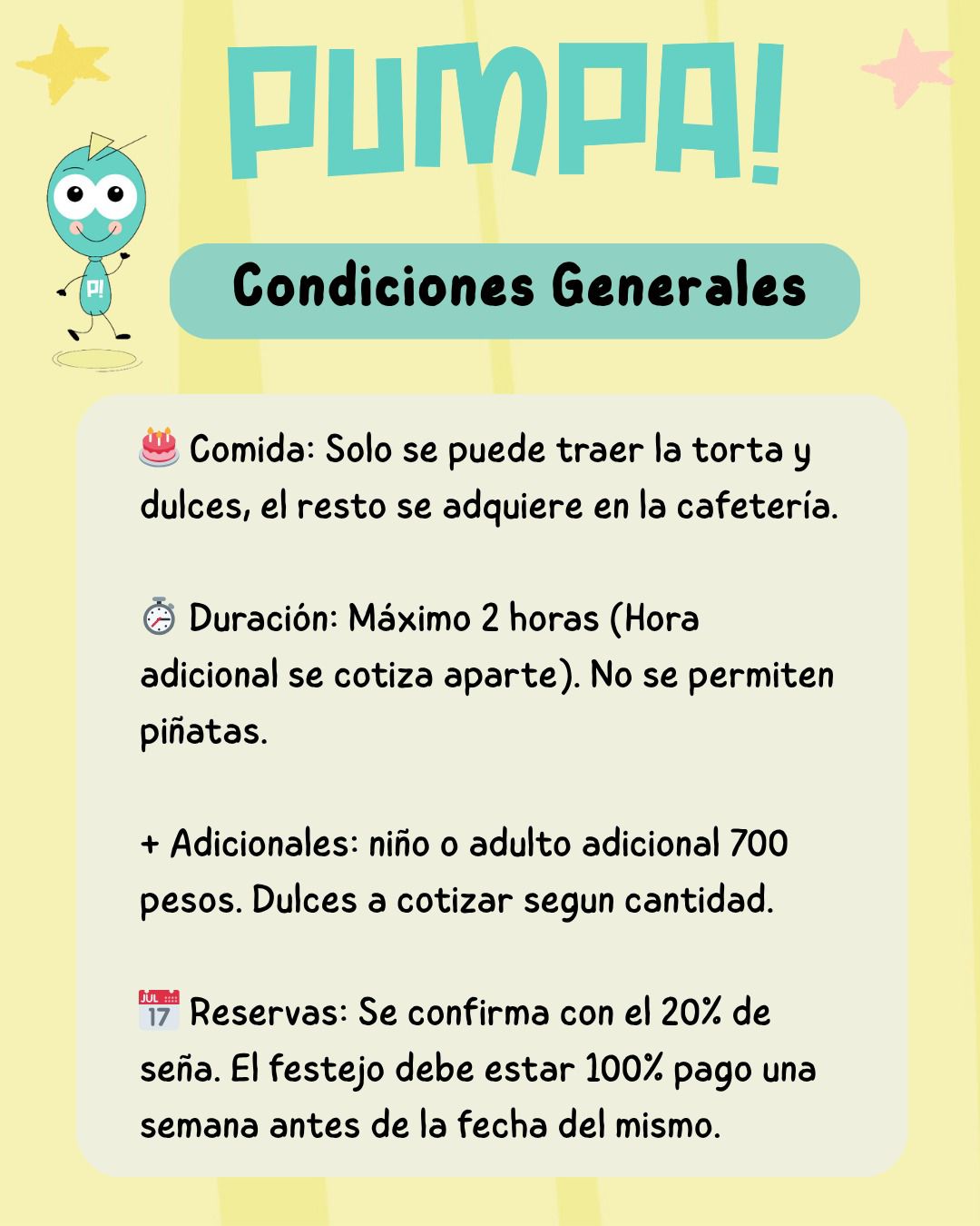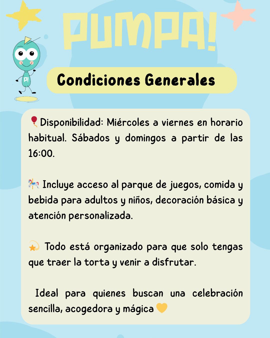 Sencillo, lindo, sin complicaciones y con toda la diversión y cuidado de PUMPA!, en un espacio exclusivo. Sólo traé la torta: de lo demás, nos encargamos nosotros.