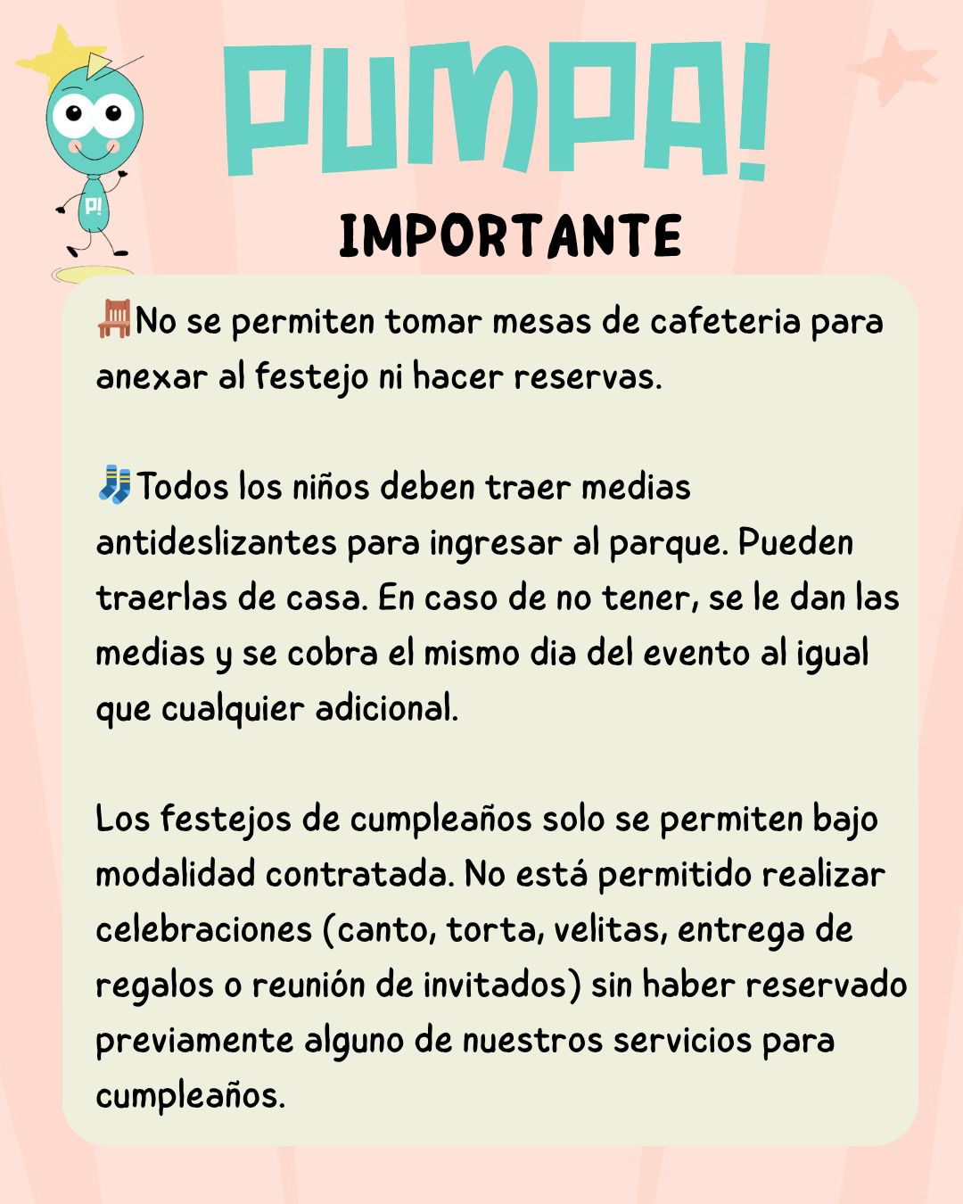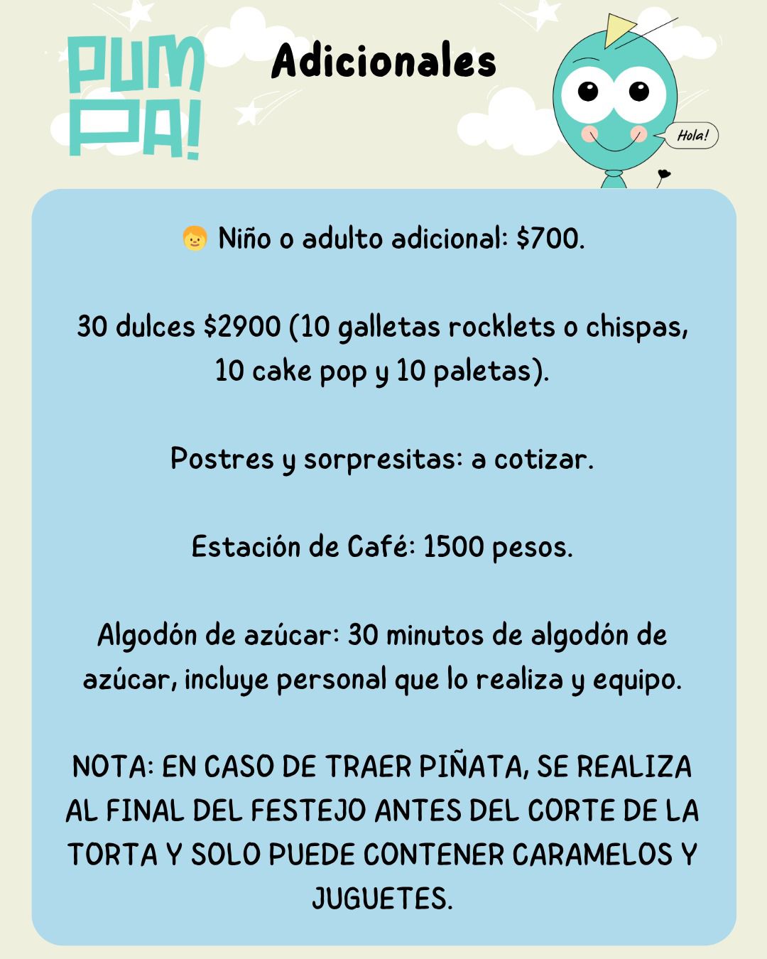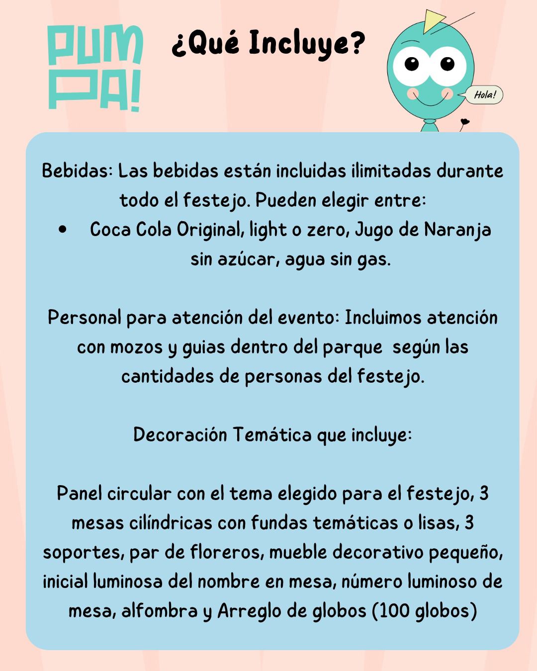 Sencillo, lindo, sin complicaciones y con toda la diversión y cuidado de PUMPA!, en un espacio exclusivo. Sólo traé la torta: de lo demás, nos encargamos nosotros.